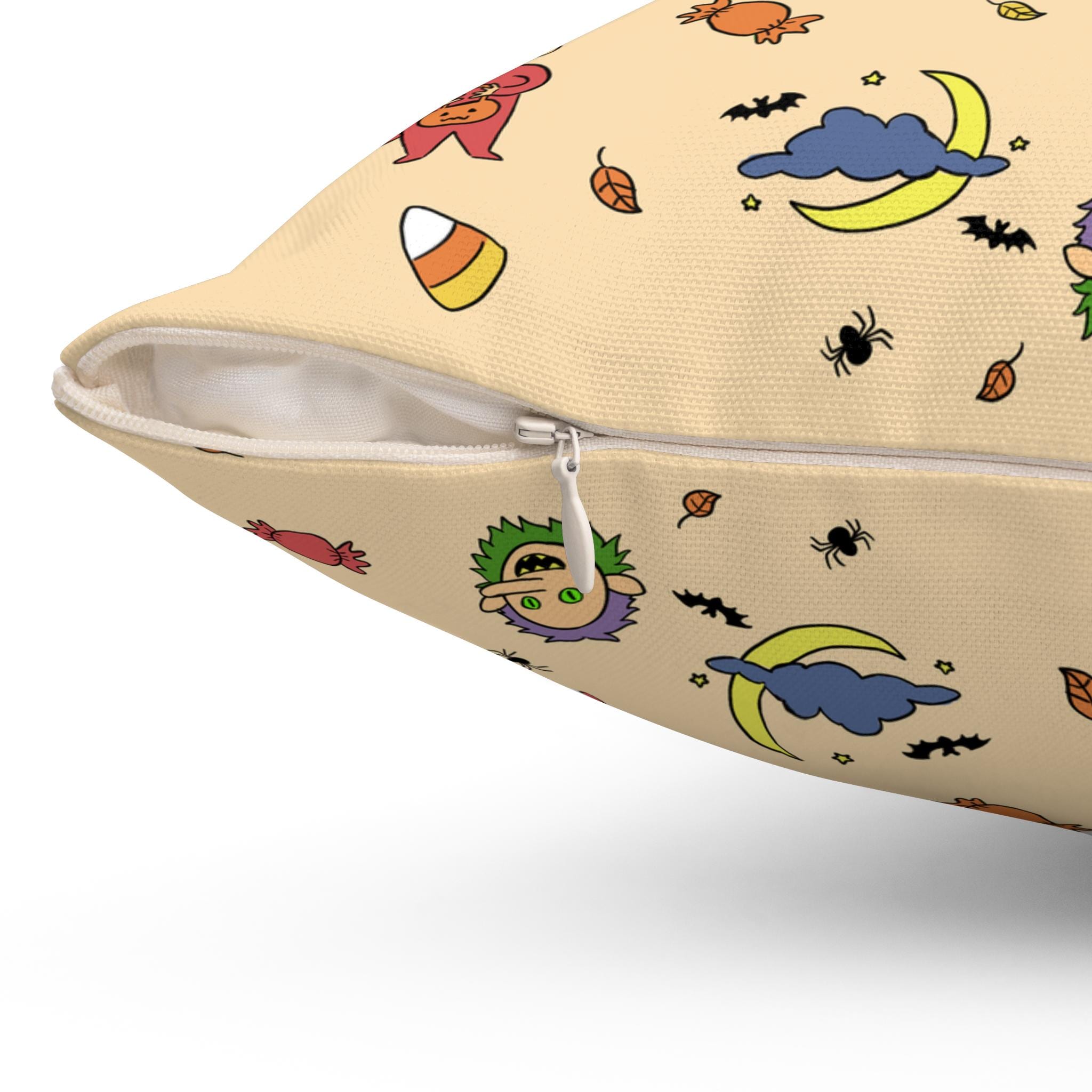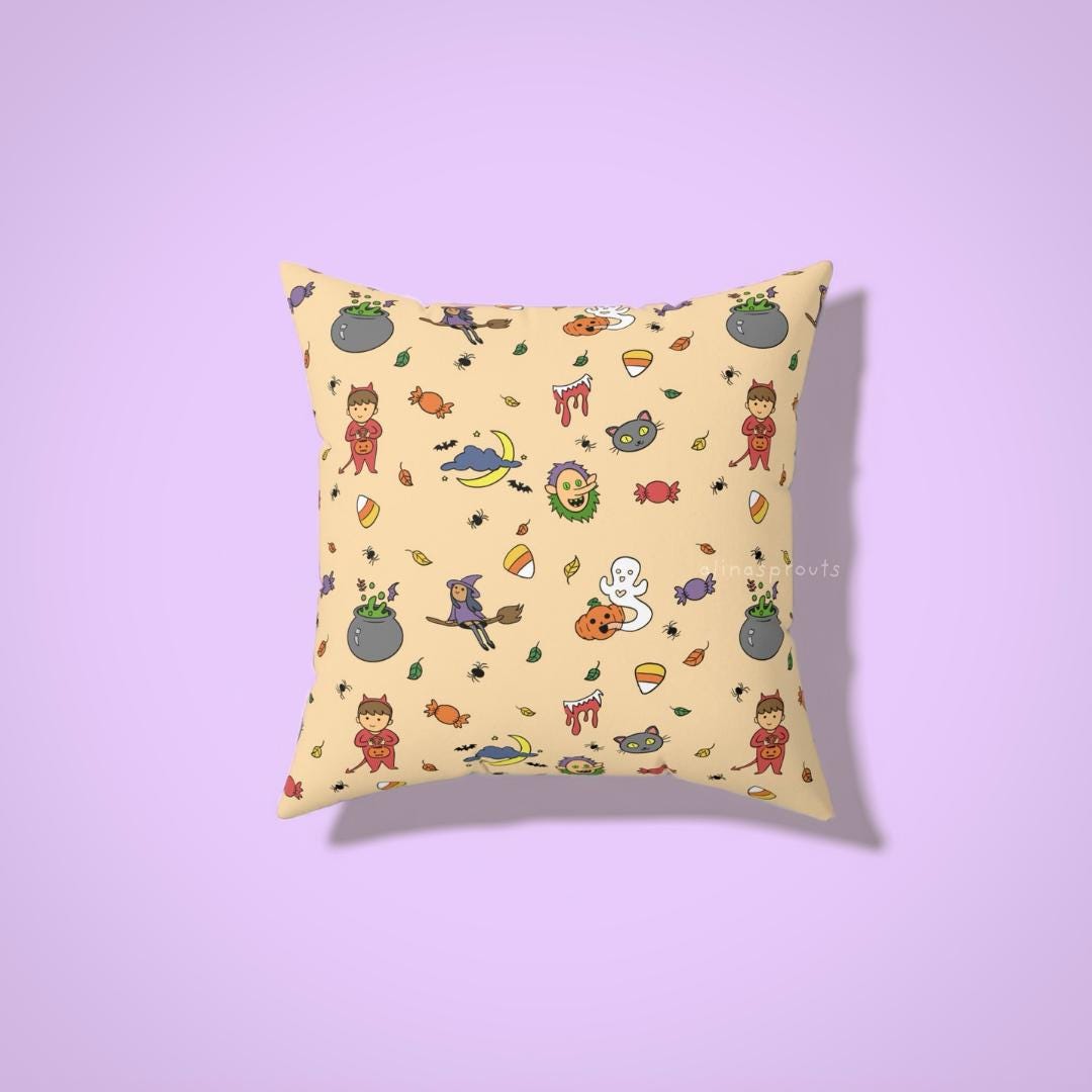 Square pillow with a halloween-themed pattern design, mixing cute and spooky. Design hand drawn by me. FREE SHIPPING.