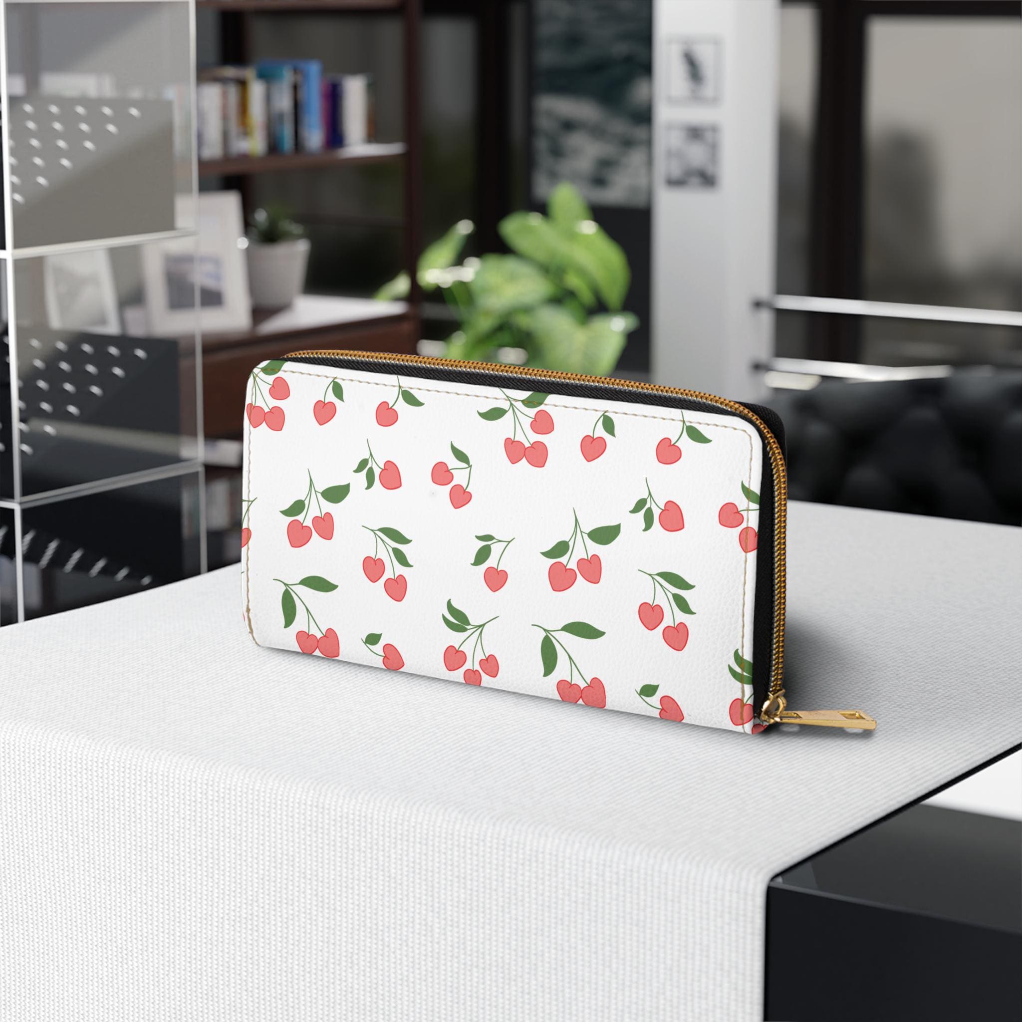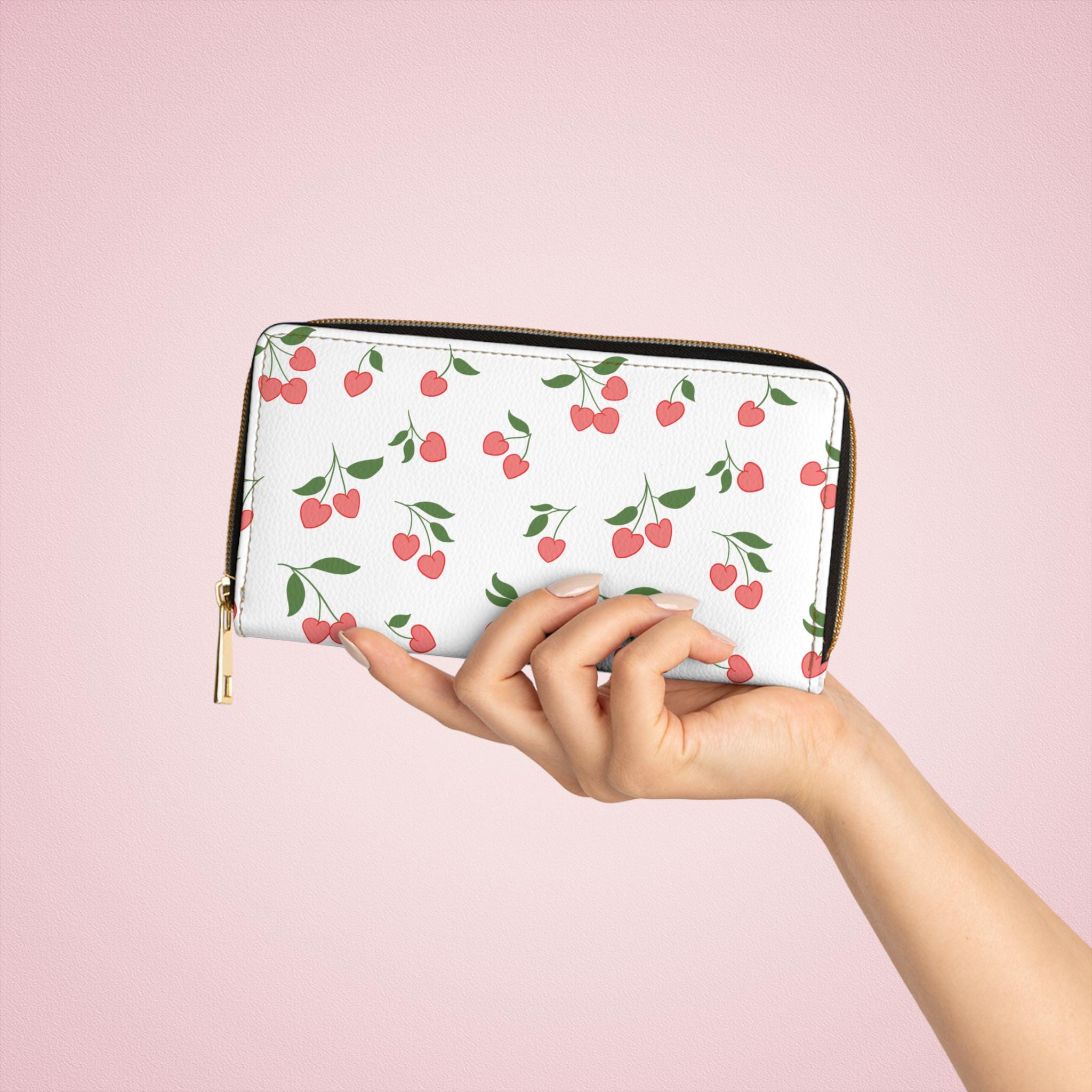 Cherry pattern zipper wallet, design hand drawn by me. Multiple pockets for cash, cards, coins, keeping everything organized.